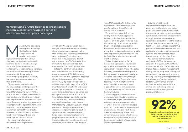 These pressures are already shaping strategic thinking across the sector. According to Deloitte’ s 2025 Smart Manufacturing Survey, 92 % of manufacturers surveyed believe smart manufacturing will be the main driver for competitiveness over the next three years. For many leaders, the question is no longer whether digital transformation is needed, but whether operations can remain competitive without it. Increasingly, transformation is driven less by technology ambition and more by operational survival. For many manufacturers, the primary challenge is a lack of visibility. When production data is delayed, siloed or manually reconciled, decisions are made reactively rather than proactively. According to McKinsey, when Industry 4.0 principles are implemented successfully, it is not uncommon to see 30-50 % reductions in machine downtime and 15-30 % improvements in labour productivity.
