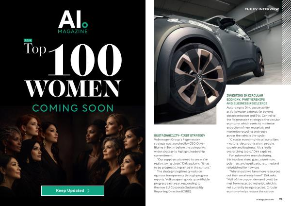INVESTING IN CIRCULAR ECONOMY, PARTNERSHIPS AND BUSINESS RESILIENCE According to Dirk, sustainability at Volkswagen extends far beyond decarbonisation and EVs. Central to the Regenerate + strategy is the circular economy, which seeks to minimise extraction of new materials and maximise recycling and reuse across the vehicle life-cycle.