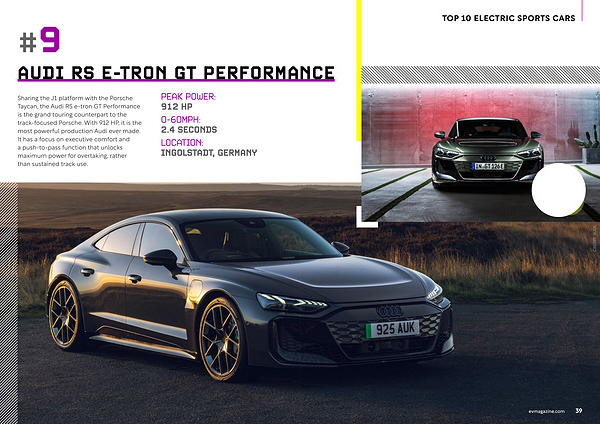 Sharing the J1 platform with the Porsche Taycan, the Audi RS e-tron GT Performance is the grand touring counterpart to the track-focused Porsche. With 912 HP, it is the most powerful production Audi ever made. It has a focus on executive comfort and a push-to-pass function that unlocks maximum power for overtaking, rather than sustained track use.