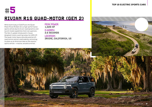 While technically an SUV / Truck, the Quad- Motor Rivian R1( Gen 2) is a high-performance sports vehicle due to its on-road dynamics and launch mode capabilities that rival supercars. The Gen 2 update introduced in-house designed motors, pushing output to 1,025 HP. The quad-motor layout provides precise offroad control and on-road stability, cementing its place as an American take on the electric sports vehicle – massive, versatile and fast.