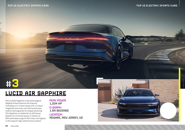The Lucid Air Sapphire is the technological flagship of the American EV industry. It employs a tri-motor setup with a unique megawatt rear drive unit that houses two motors and a gearset for torque vectoring. The Sapphire is notable for its efficiency; despite its immense power, it retains an EPA-estimated range of 427 miles, the highest in this specific high-performance cohort.