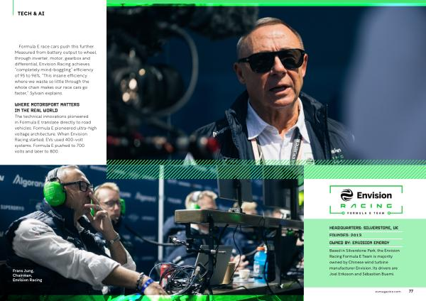 WHERE MOTORSPORT MATTERS IN THE REAL WORLD The technical innovations pioneered in Formula E translate directly to road vehicles. Formula E pioneered ultra-high voltage architecture. When Envision Racing started, EVs used 400-volt systems. Formula E pushed to 700 volts and later to 800.